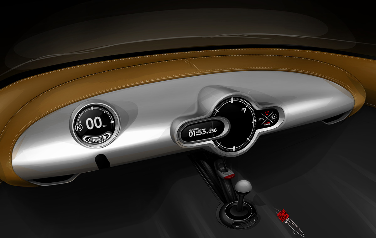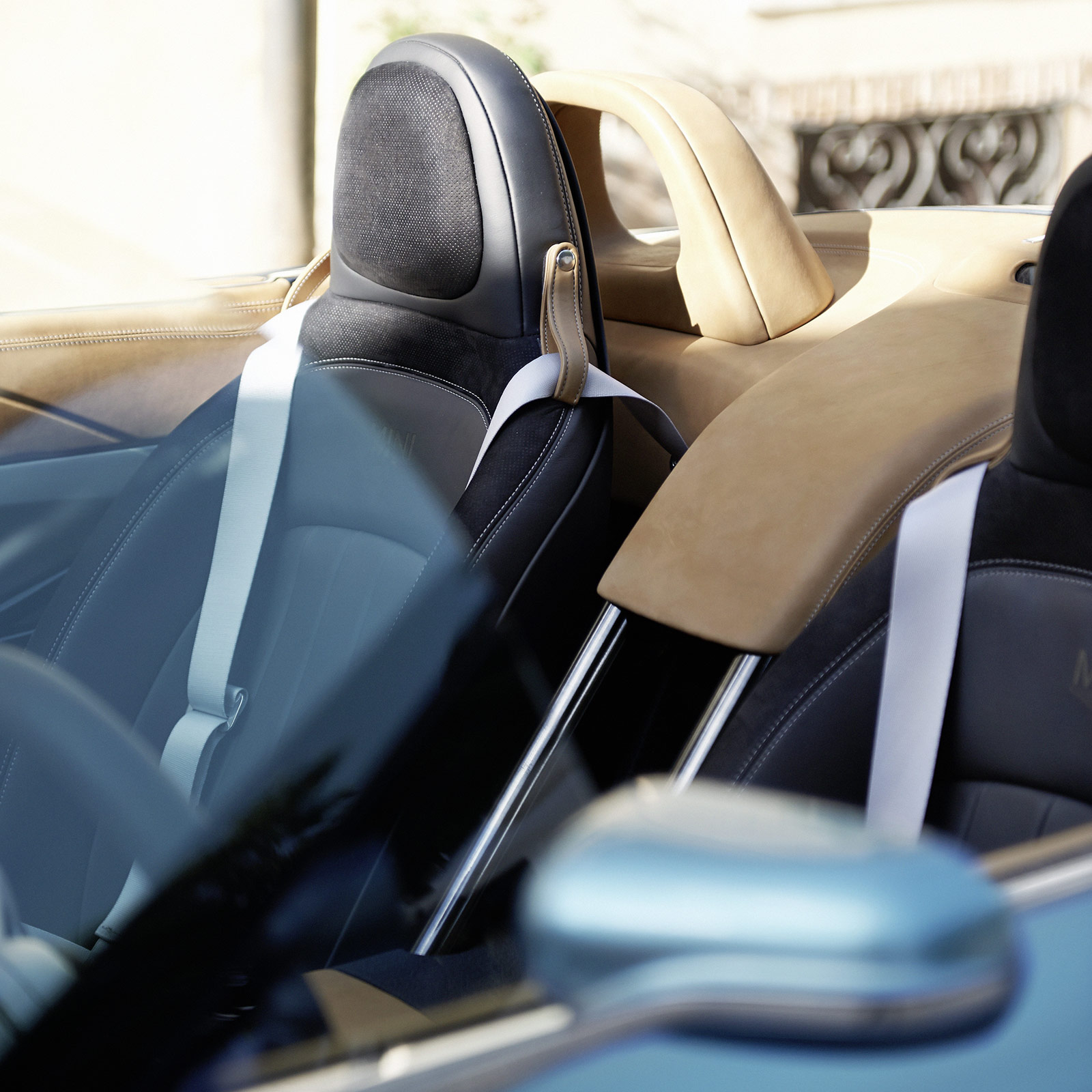 It is a truly fresh interpretation of a two-seater open car, a compact and agile roadster melding authentic British style with Italian flair. Its electric drivetrain gives the car distinctly modern driving dynamics. Only high-end materials such as premium leather hides, solid aluminium and black chrome are employed, to highlight the essential aesthetics of the interior.