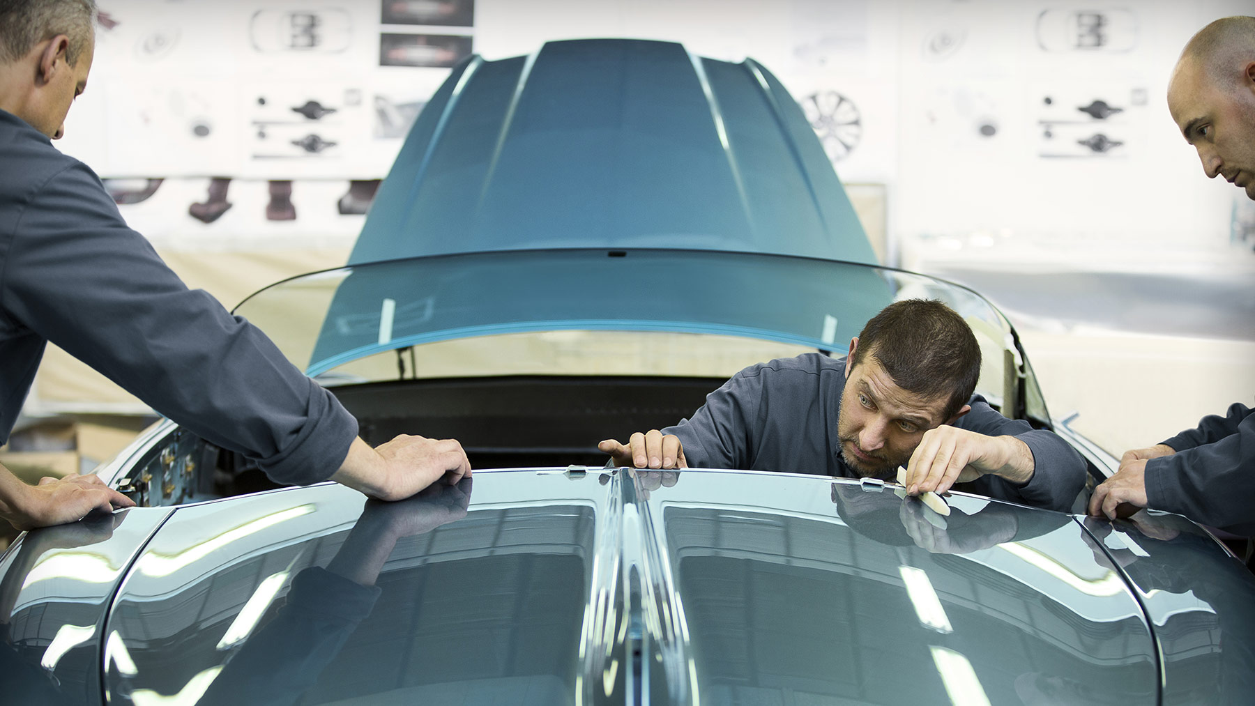 Expert panel beaters turn sheet metal into complex shapes, using hammers and dollies, and finishing with files.
