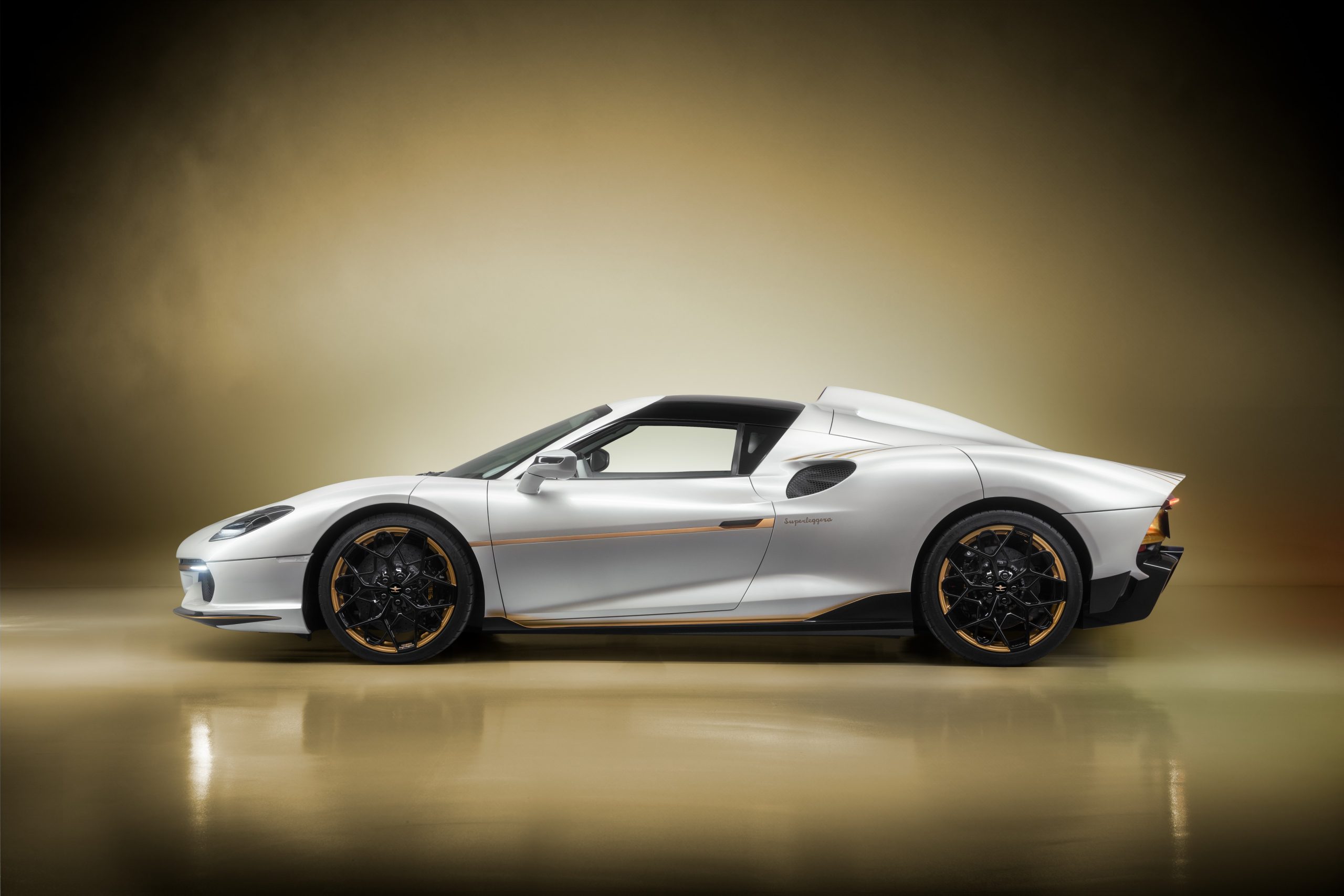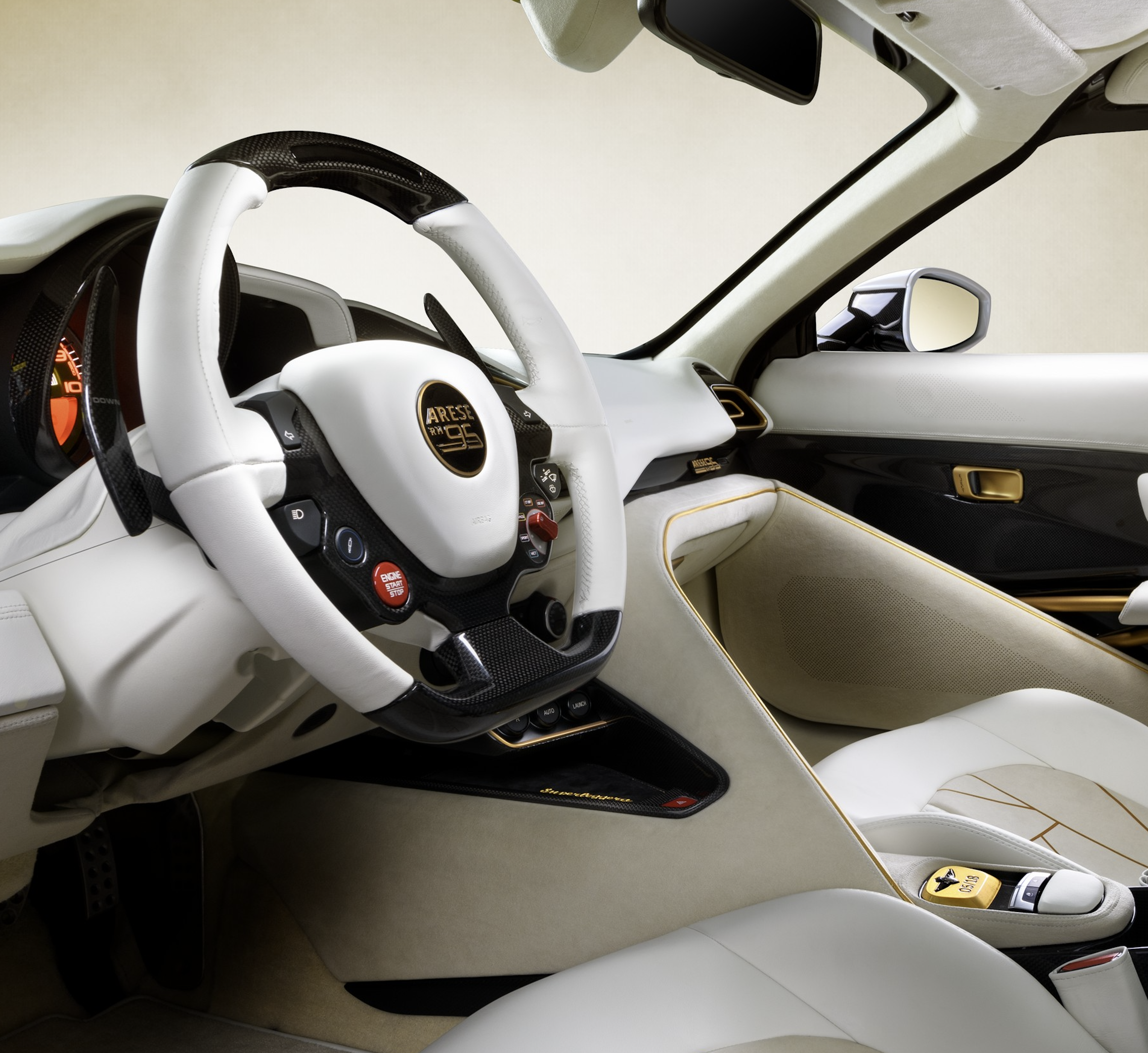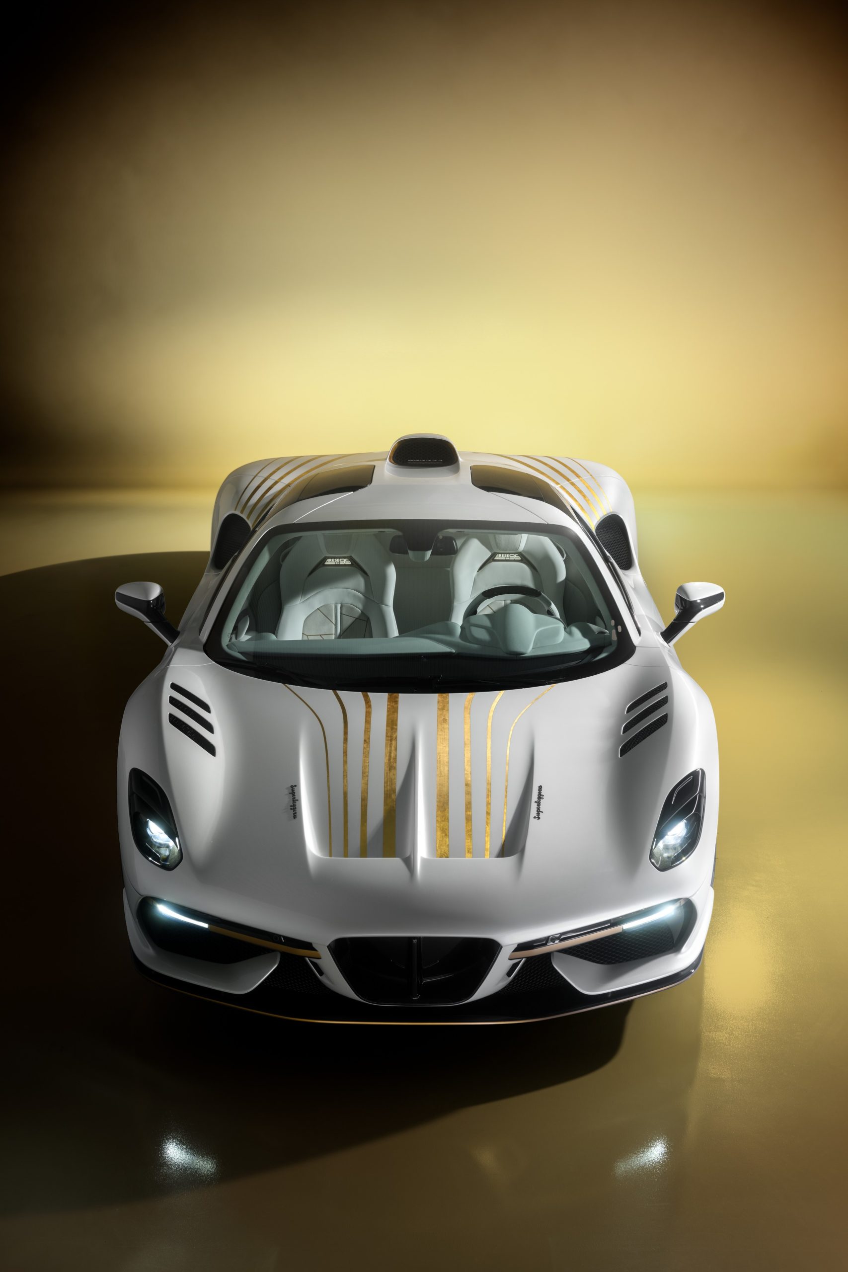 Harmonizing elegance and sportiness, the Arese RH95 Vento D’Oro showcases a stunning combination of white and gold details. This exquisite blend highlights the car’s performance while exuding refined luxury. The white Morning Frost colour adds sophistication, while the vibrant Gold leaf accents inject energy.