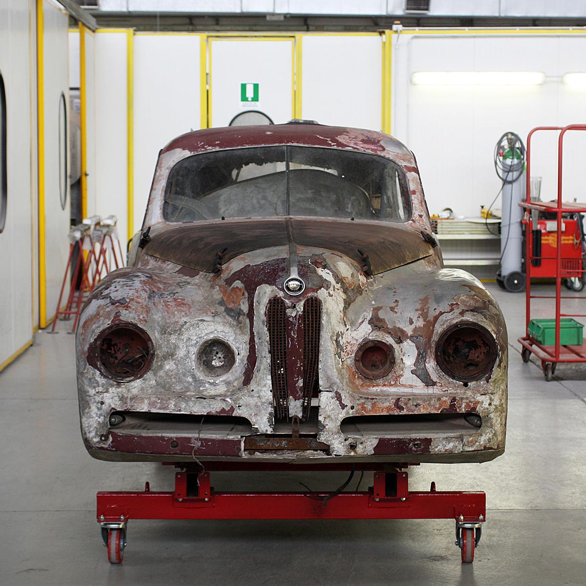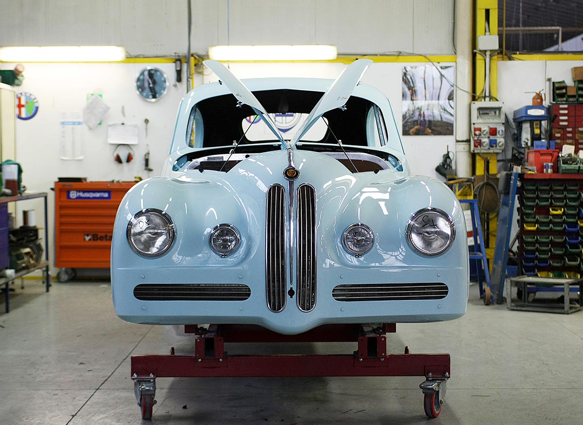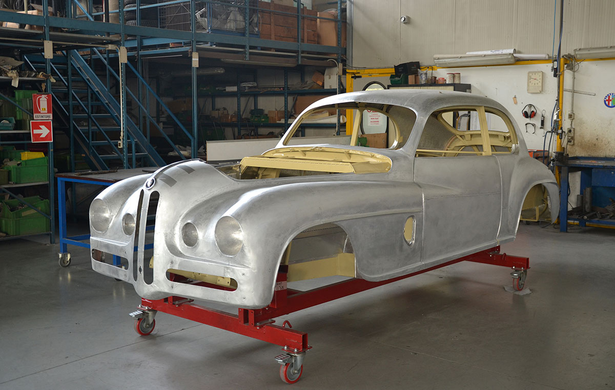 The car was found abandoned alongside several other early Bristols on a French farm in 2011. It was in such a state of disrepair that, upon being shipped back to Touring’s Milanese headquarters, the bodywork was deemed unsalvageable. Instead, it was used as a reference from which the coachbuilder’s master metalworkers could work.