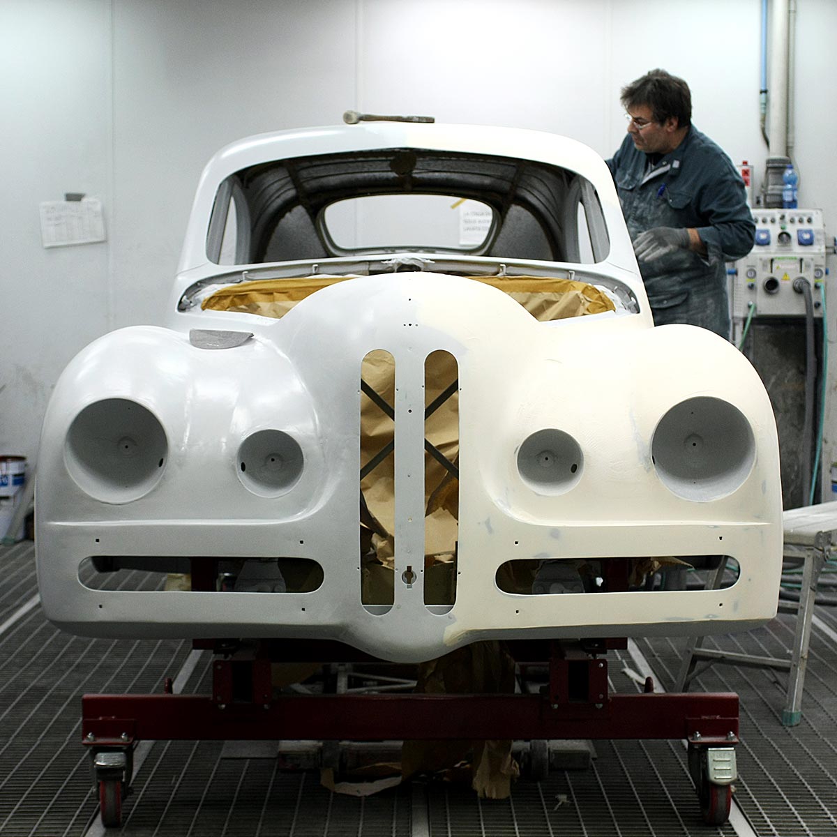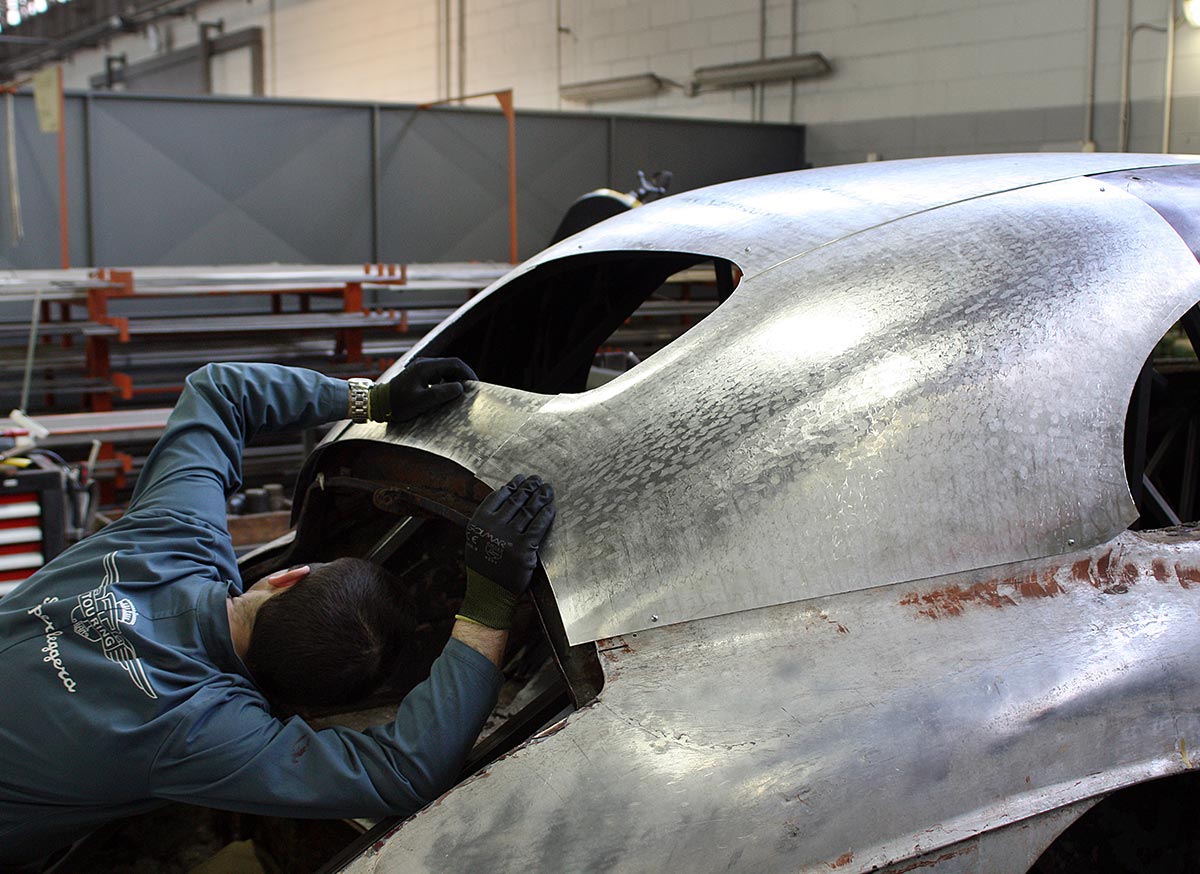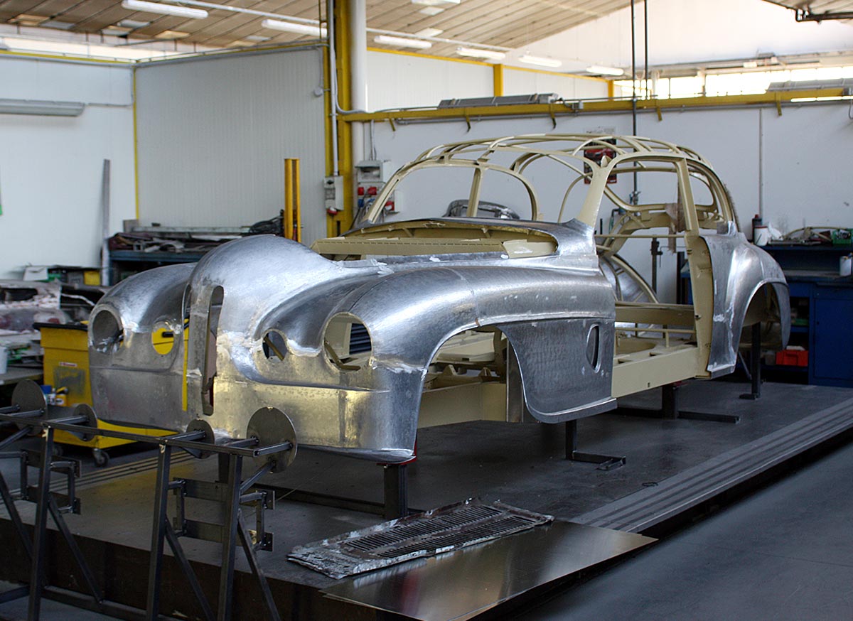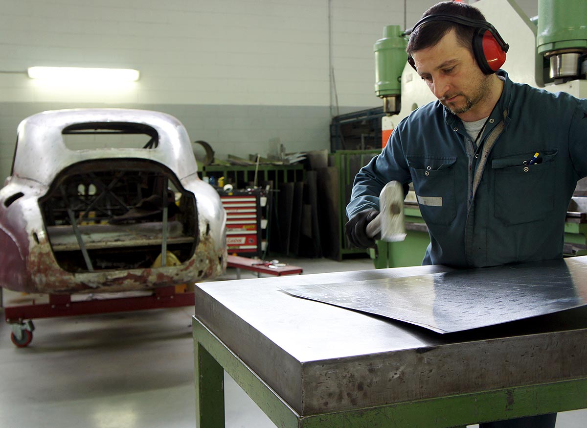 Touring atelier’s philosophy is to preserve originality in classic cars. Panels were hand beaten in the traditional manner, and the precision instrumentation and digital measuring and control equipment we use for our modern masterpieces is avoided. In this way we can preserve the character of the old car, even, where appropriate, keeping the flaws and irregularities of the first hand-made manufacture.