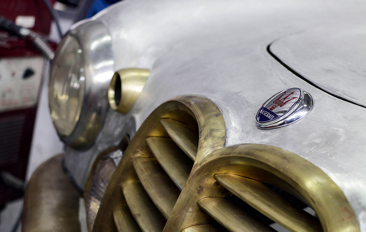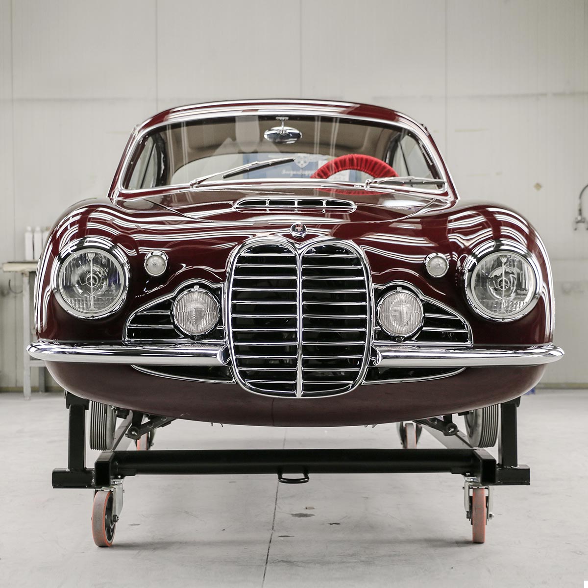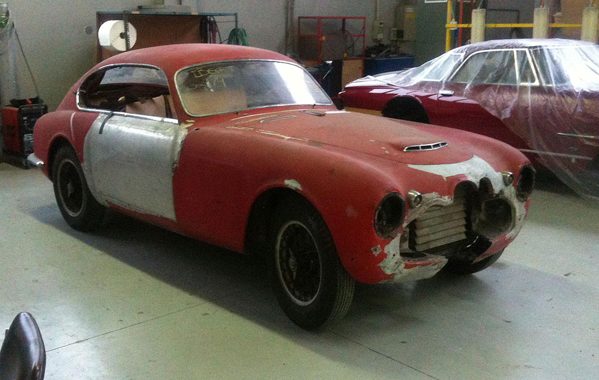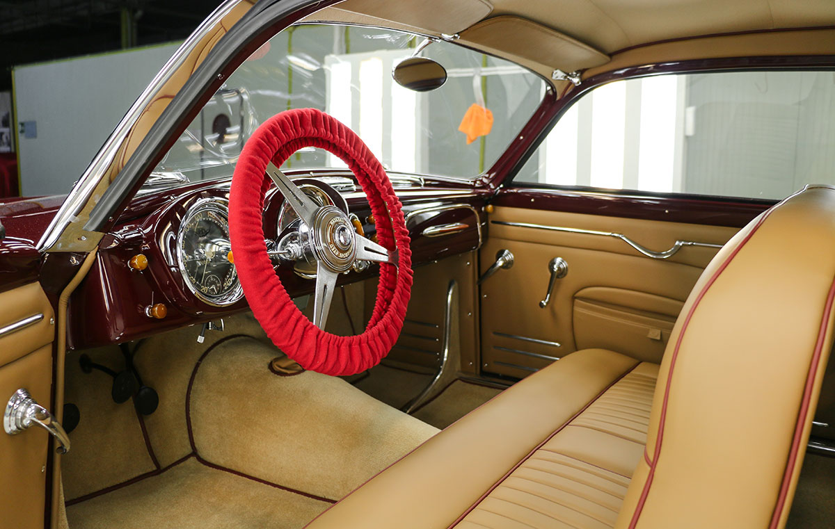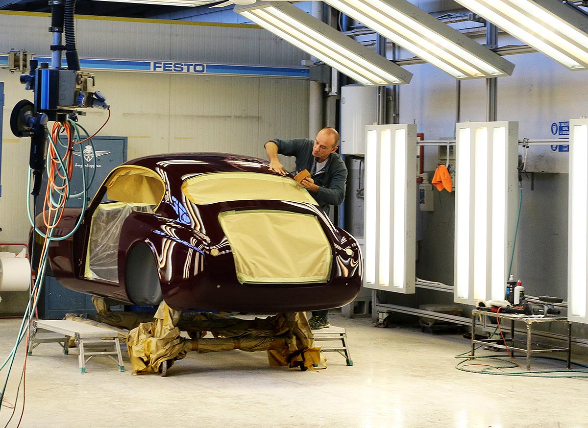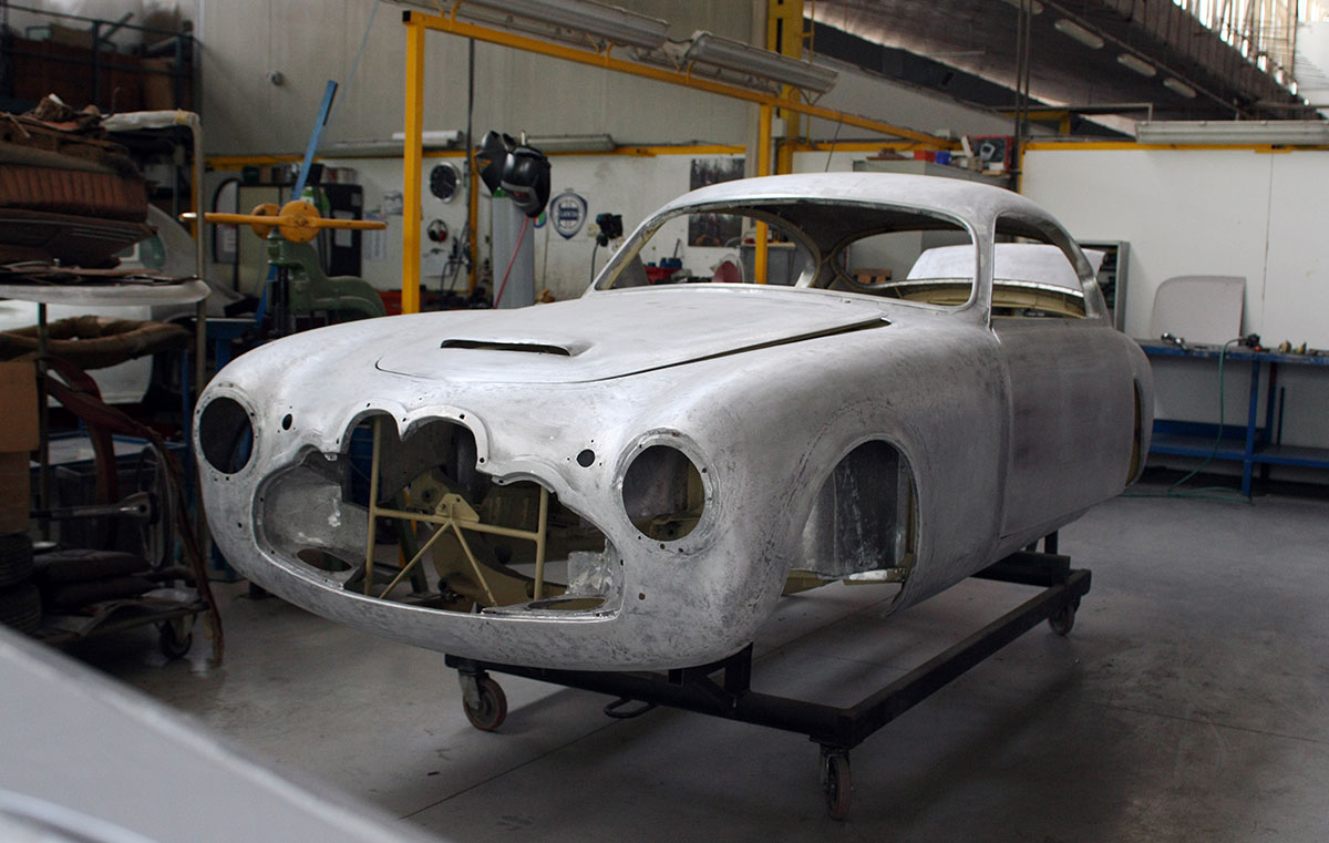 The body was then re-assembled on its underpinnings, and adjusted for gap and surface alignment. After trial fitment of trim and brightwork, the Frua was painted in the original Amaranto maroon shade, replacing the overused and incorrect bright red.